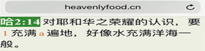 点击“下一步”,或者上面的“第一”等,将逐步介绍在本站如何快速地寻找哈巴谷书二章14节:对耶和华之荣耀的认识,要充满遍地,好像水充满洋海一般。