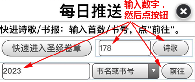 在同样每天一次的推送界面上,有快速进入诗歌和书报:只需输入数字(事先记住书报的书号)再点“进入”就实现只要刷新一次,就可以直接进到相关书报和诗歌(大本、补充、本儿童诗歌有重复的,要再点一次)。