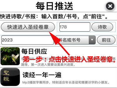 1. 打开本站后,在每天一次的推送界面上,点击“快速进入圣经卷章”。