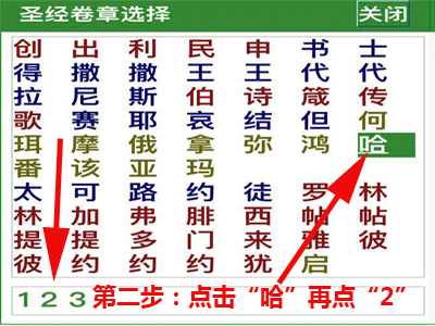 2. 在弹出的圣经卷章选择中,先点“哈”字,接着点“2”字。然后,需要一次打开新页面的刷新就进入哈巴谷书第二章。